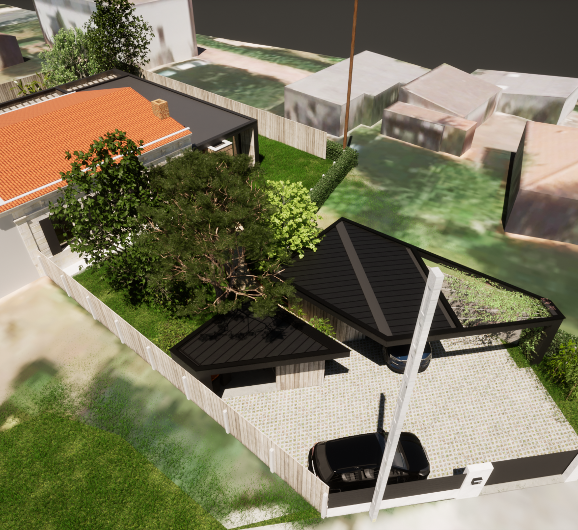 Création d'annexes à la maison Chübu pour la création d'une piscine, d'une zone d'extension de la terrasse existante sur jardin arrière et d'annexes sur rue pour Atelier et Carport